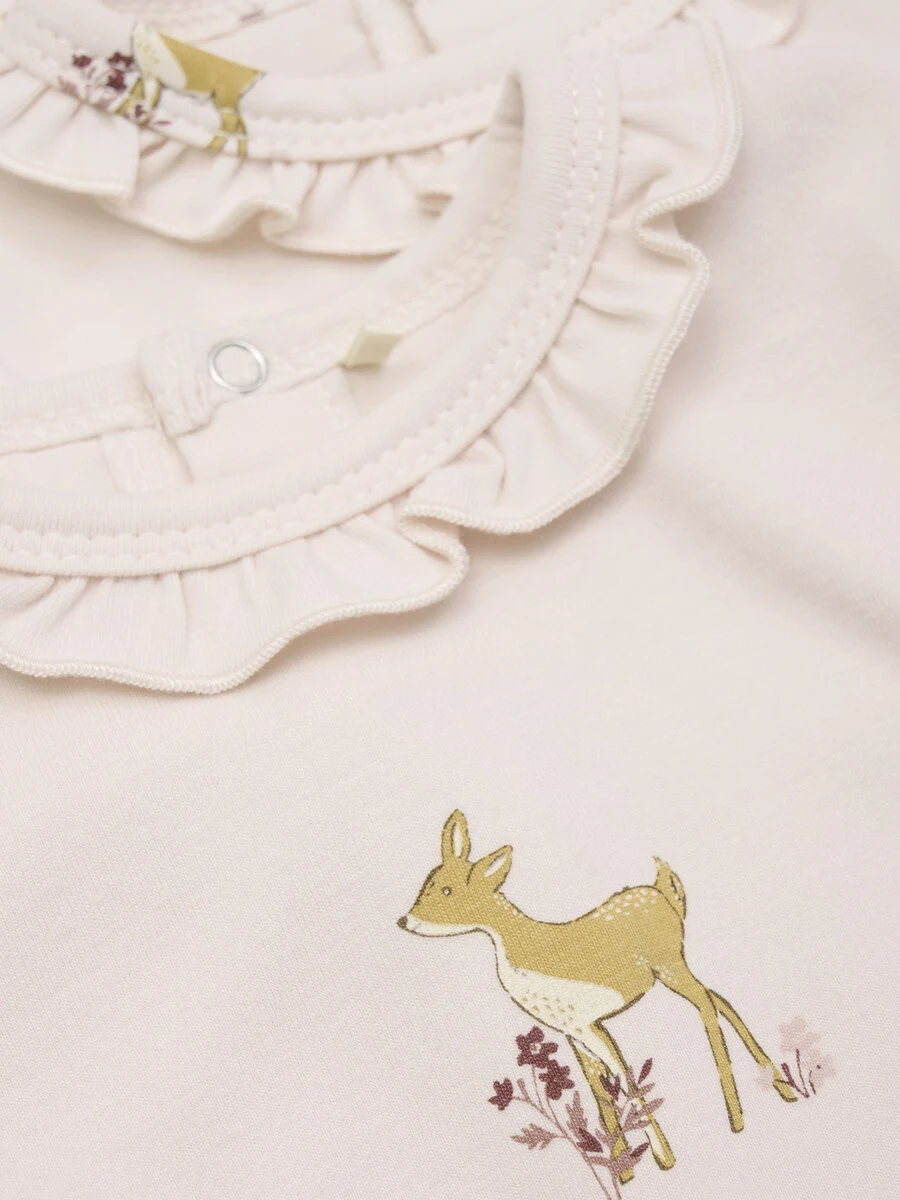 Langærmet slå-om-body fra FIXONI. Bodyen åbnes med praktiske trykknapper foran og mellem benene, så den nemt kan tages af og på. Certificeret i henhold til GOTS - økologisk CERES-0366