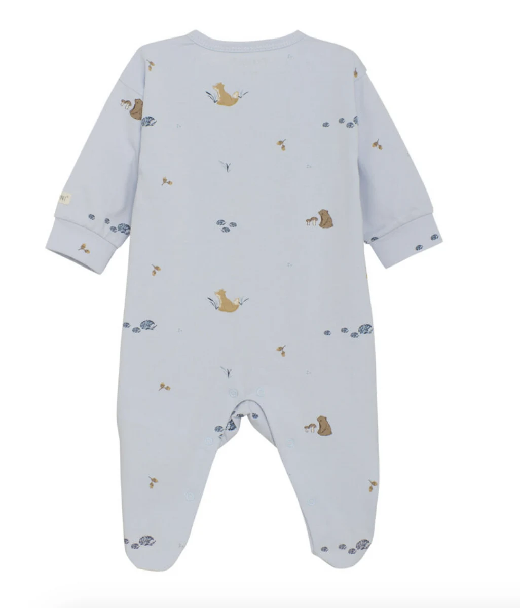 Jumpsuit med fødder fra FIXONI. Dragten har et heldækkende print. Dragten åbnes med praktiske trykknapper foran og mellem benene, så den er nem at tage af og på. Certificeret i henhold til GOTS - økologisk CERES-0366
