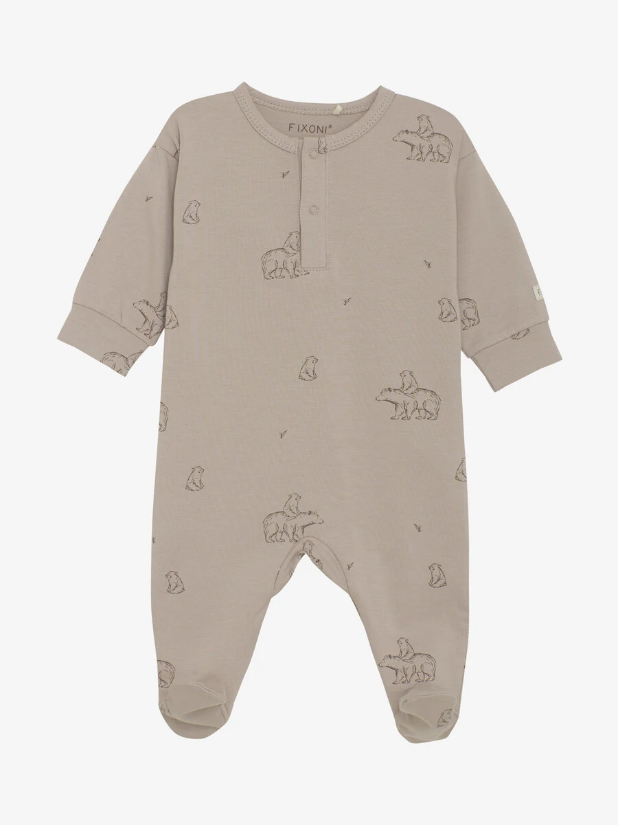 Jumpsuit med fødder fra FIXONI. Dragten har et heldækkende print. Dragten åbnes med praktiske trykknapper foran og mellem benene, så den er nem at tage af og på. Certificeret i henhold til GOTS - økologisk CERES-0366