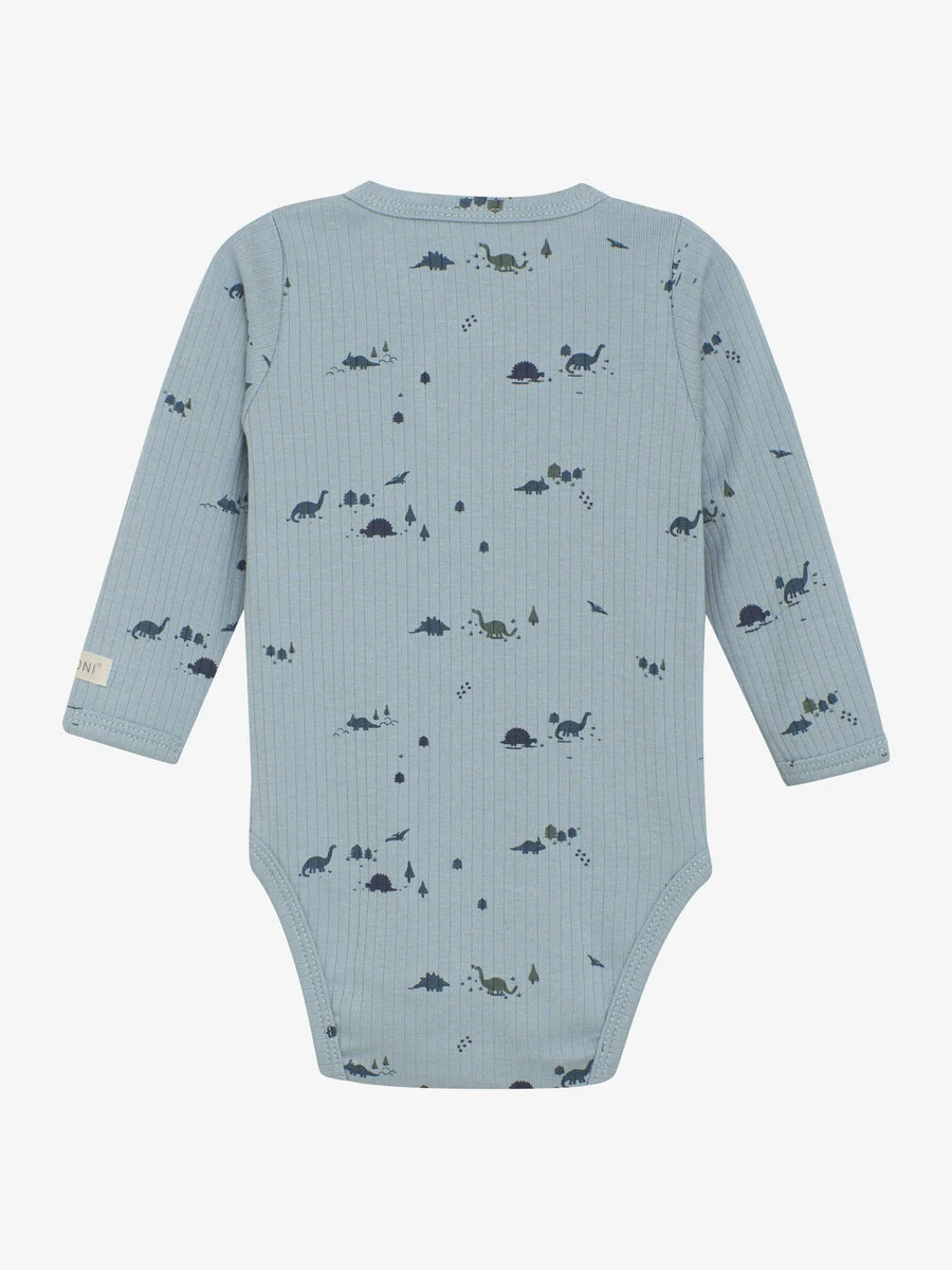Langærmet, ribkantet slå-om-body fra FIXONI. Bodyen har et heldækkende print og åbnes med praktiske trykknapper foran og mellem benene, så den nemt kan tages af og på. Certificeret i henhold til OEKO-TEX® STANDARD 100. Cert. nr. 2276-364 DTI.