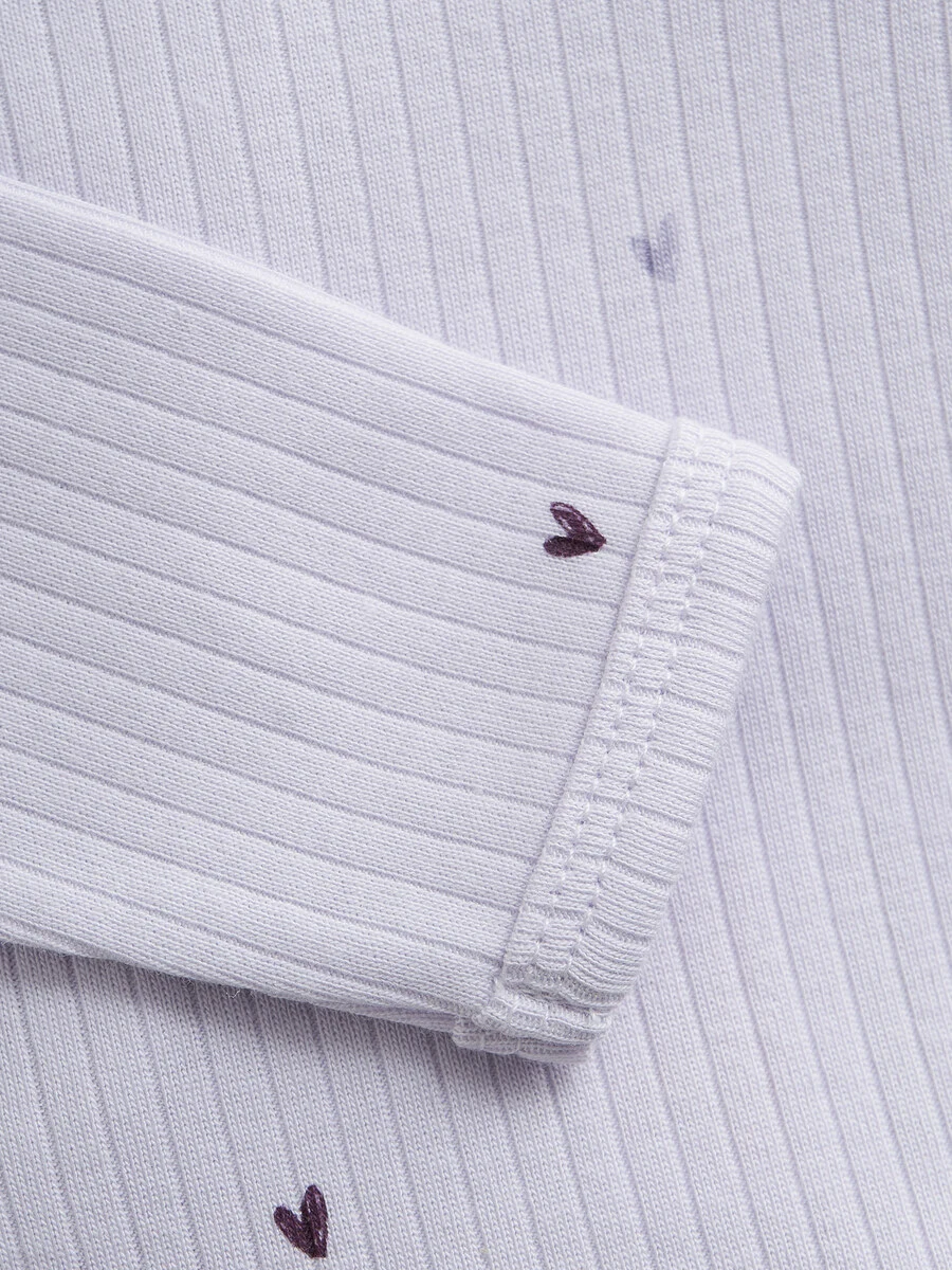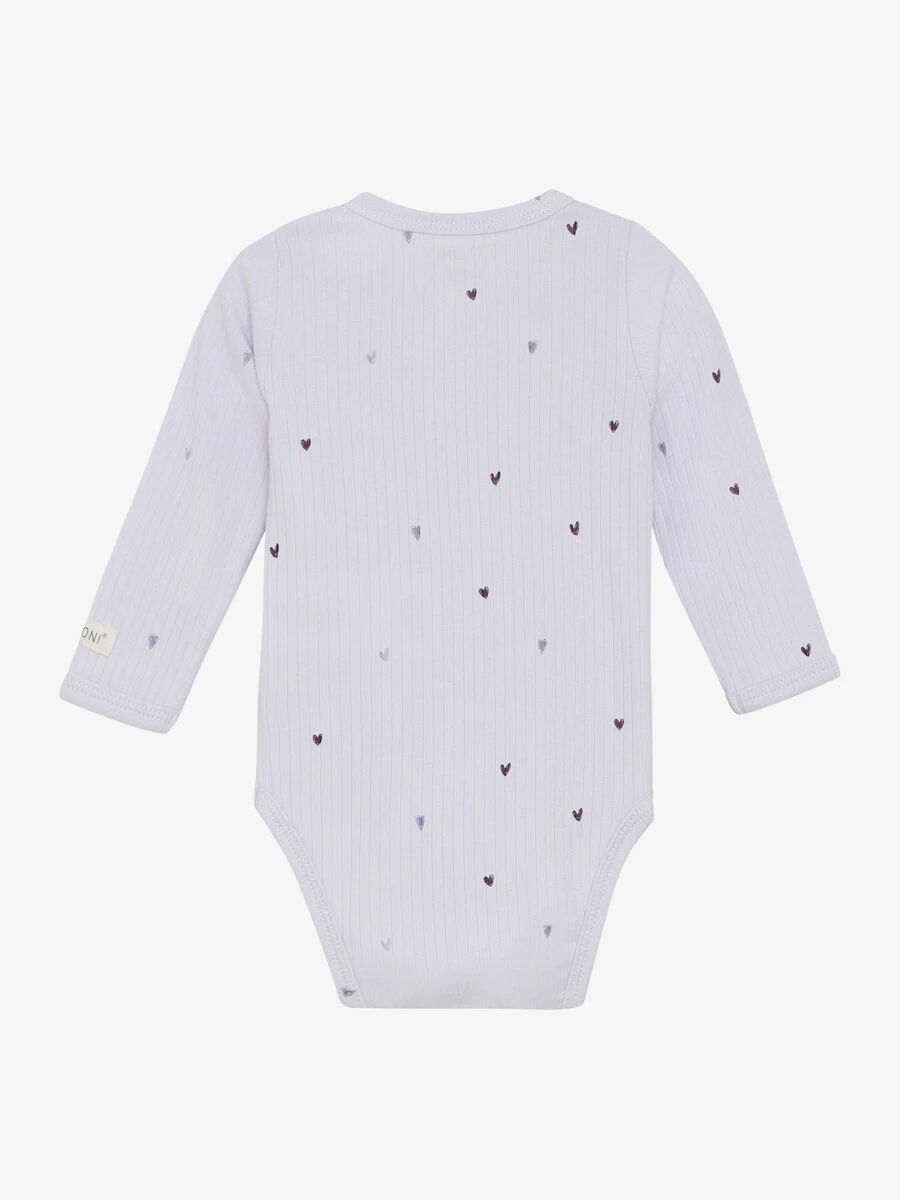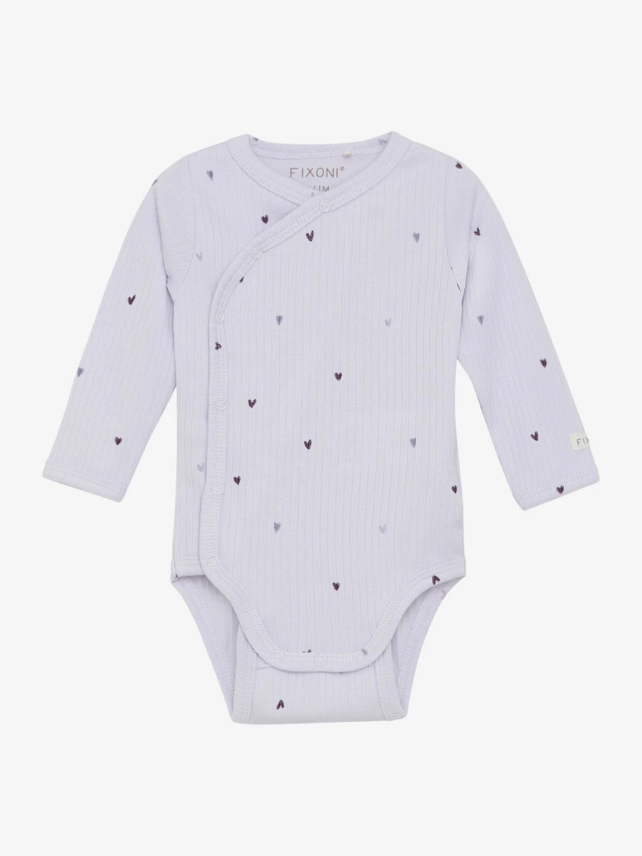 Langærmet, ribkantet slå-om-body fra FIXONI. Bodyen har et heldækkende print og åbnes med praktiske trykknapper foran og mellem benene, så den nemt kan tages af og på. Certificeret i henhold til OEKO-TEX® STANDARD 100. Cert. nr. 2276-364 DTI.