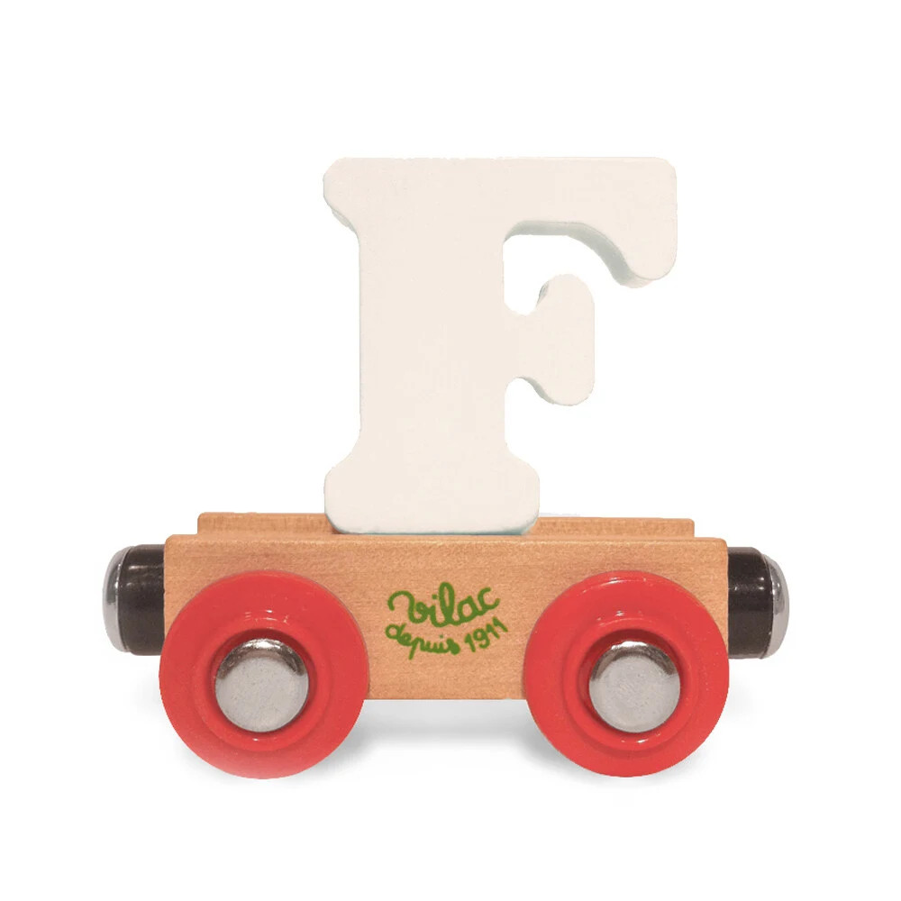 Togvogn med bogstavet F og magnetkobling i begge ender, så den kan trækkes af Vilacs lokomotiv og sættes sammen med andre vogne til et helt alfabettog.