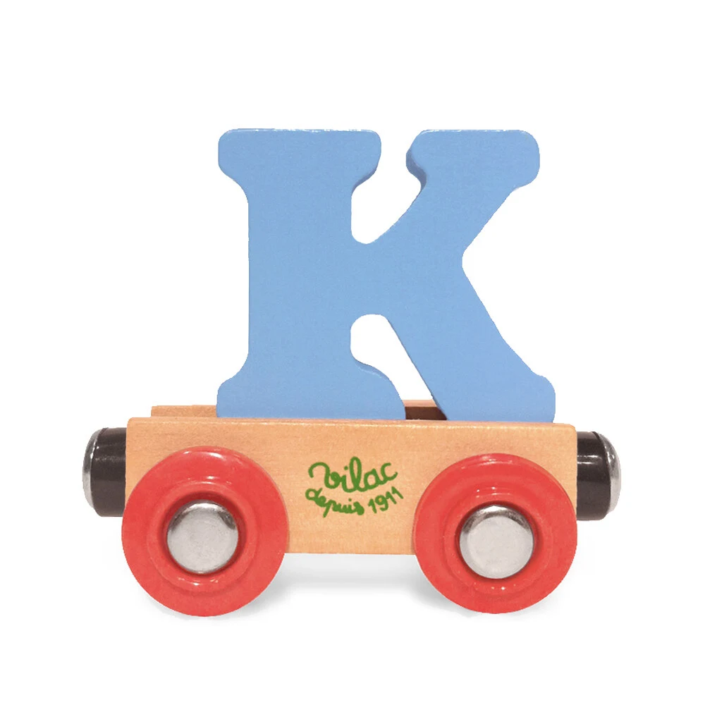 Togvogn med bogstavet K og magnetkobling i begge ender, så den kan trækkes af Vilacs lokomotiv og sættes sammen med andre vogne til et helt alfabettog.