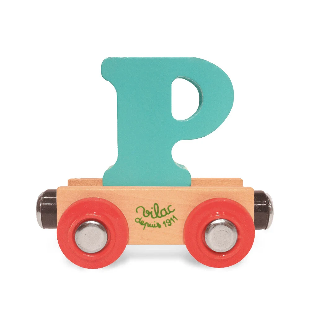 Togvogn med bogstavet P og magnetkobling i begge ender, så den kan trækkes af Vilacs lokomotiv og sættes sammen med andre vogne til et helt alfabettog.