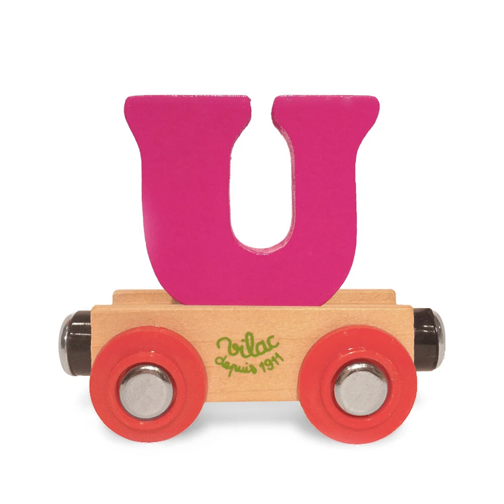 Togvogn med bogstavet U og magnetkobling i begge ender, så den kan trækkes af Vilacs lokomotiv og sættes sammen med andre vogne til et helt alfabettog.