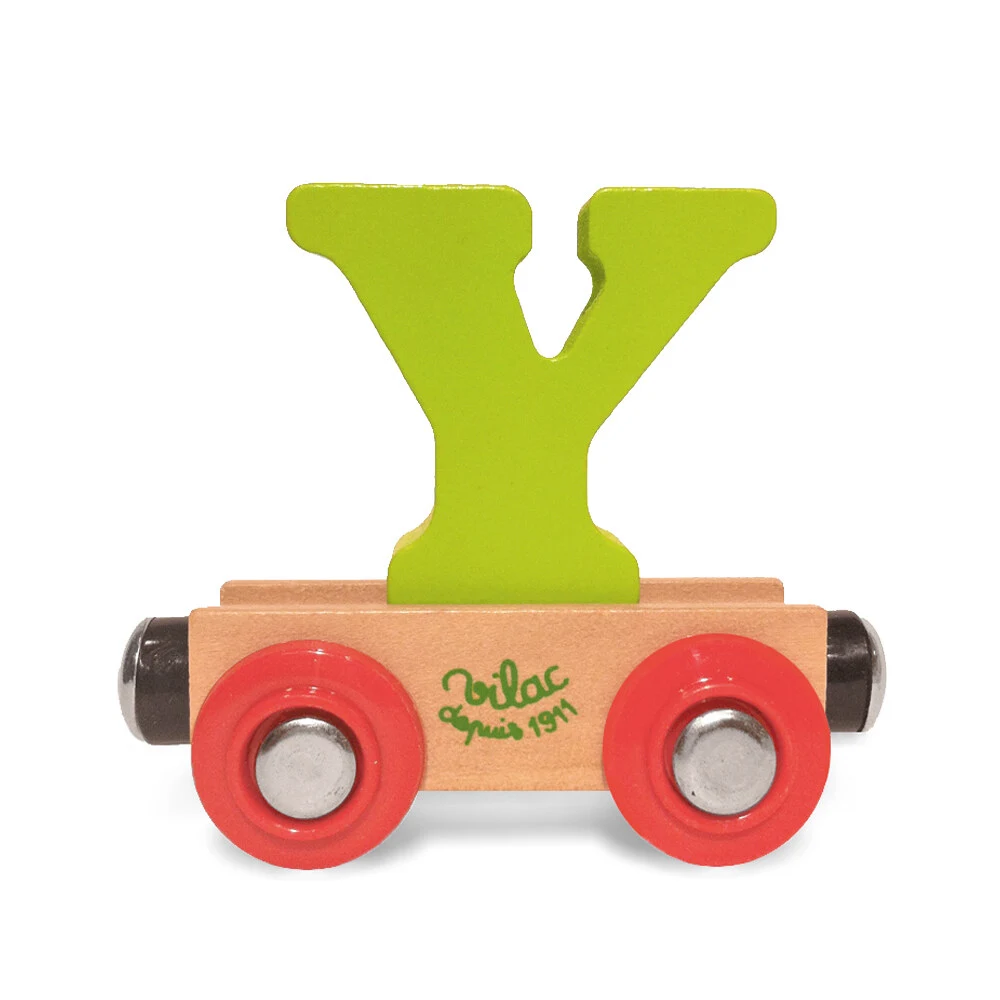 Togvogn med bogstavet Y og magnetkobling i begge ender, så den kan trækkes af Vilacs lokomotiv og sættes sammen med andre vogne til et helt alfabettog.