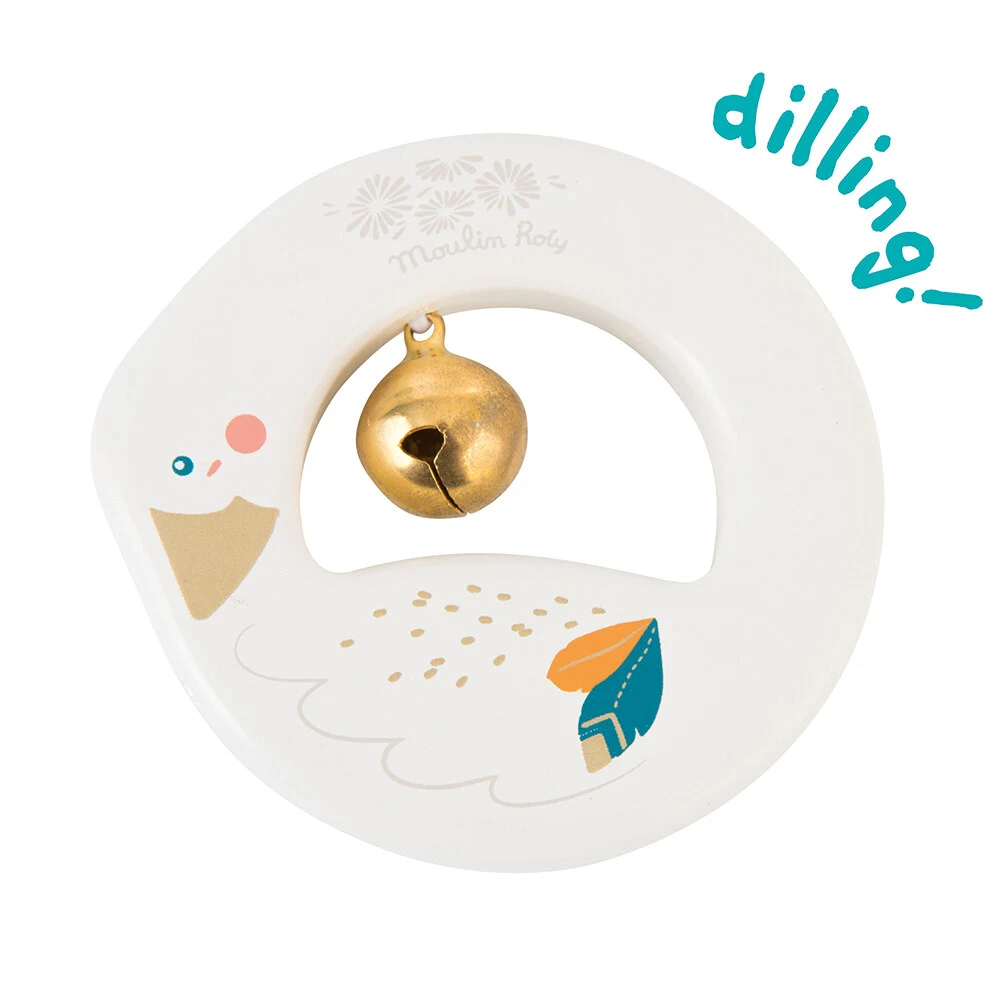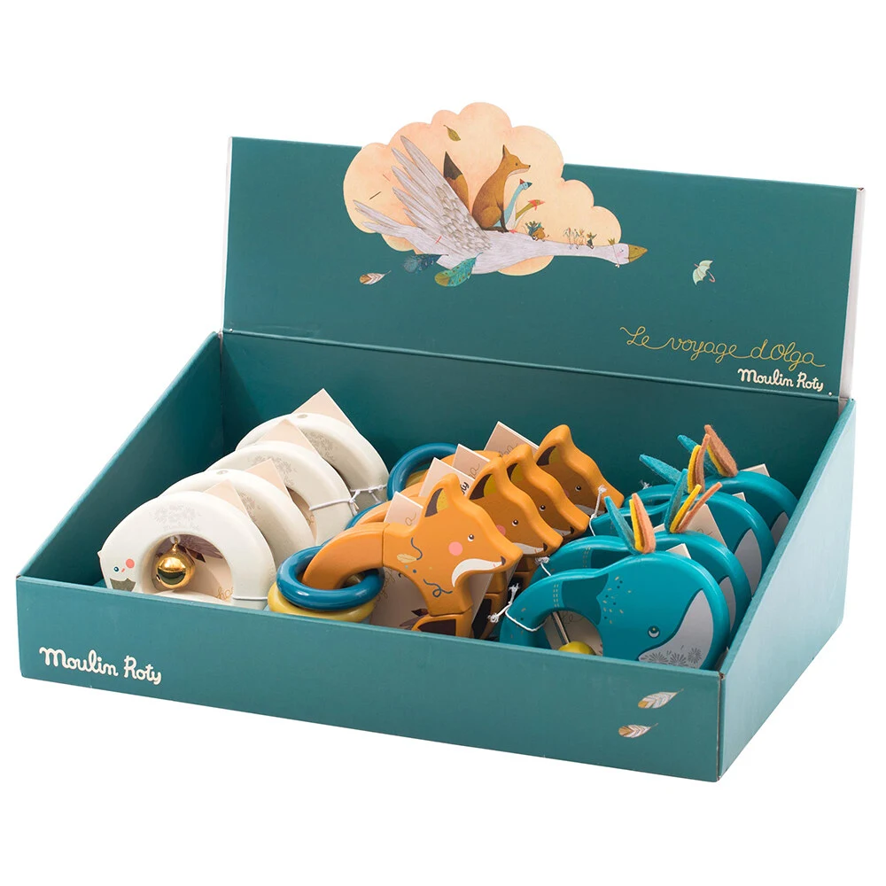 Display med fire gåserangler, fire hvalrangler og fire ræverangler. Fremstillet af træ i flotte farver og fint dekoreret. Ideelt til stimulering af babyens høre- og følesans og til udvikling af babyens evne til at gribe fat om en genstand.