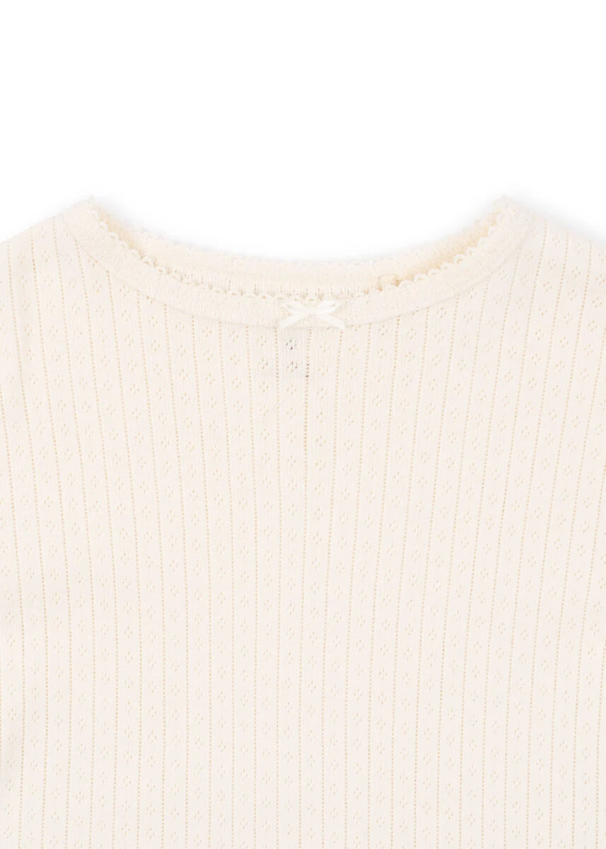 Denne bluse i 100% økologisk GOTS-certificeret bomuld tilbyder blød komfort og dekorativ pointelle. Perfekt som base layer eller i din daglige garderobe – et bæredygtigt og stilfuldt must-have.