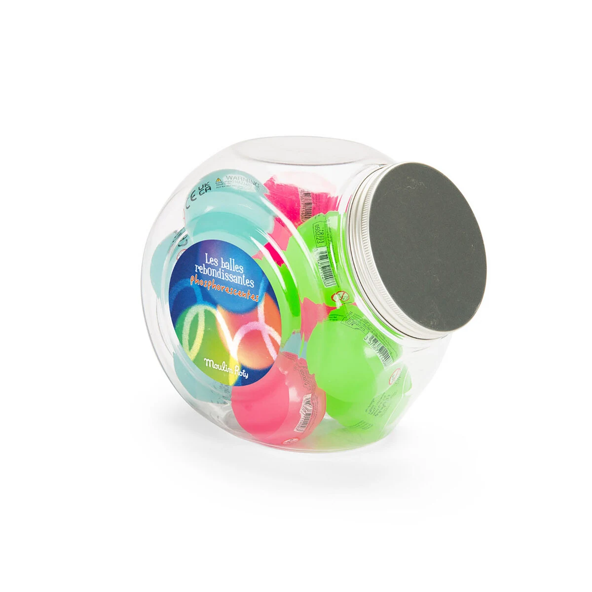 Gennemsigtig krukke med 12 assorterede pink, grønne og blå hoppebolde, som lyser i mørke.