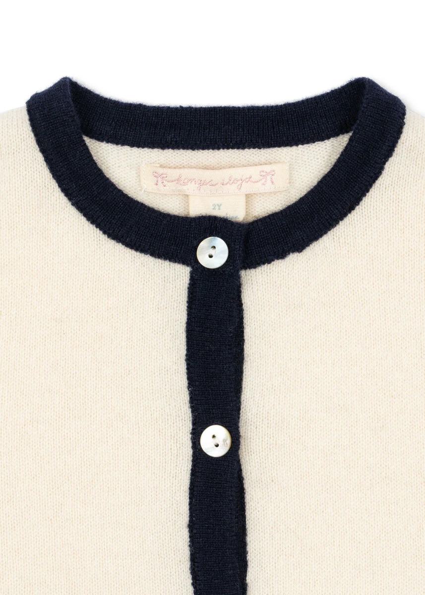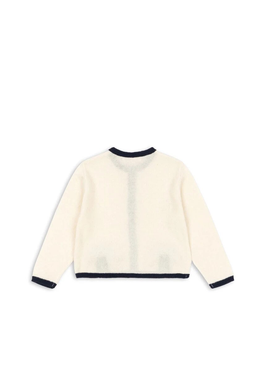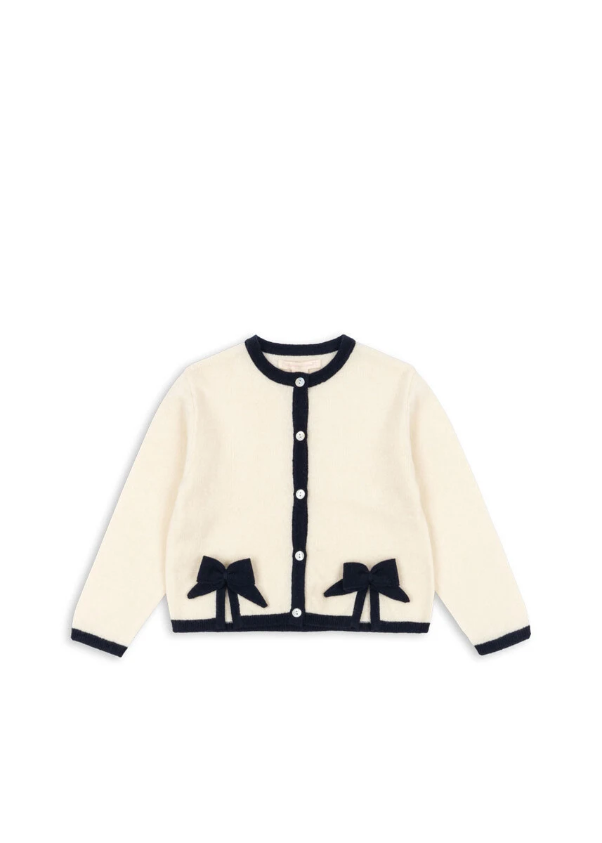 Blød cardigan i 100% uld med sløjfedetaljer. Klassisk design med rund hals, kontrastkanter og perlemorsknapper.