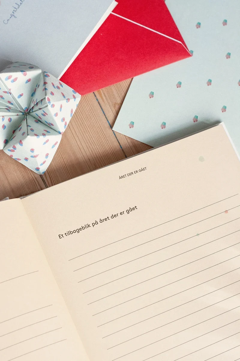 - Indsæt billeder fra dagen og skab en ny tradition med en årlig tegning eller et hånd- og fodaftryk.