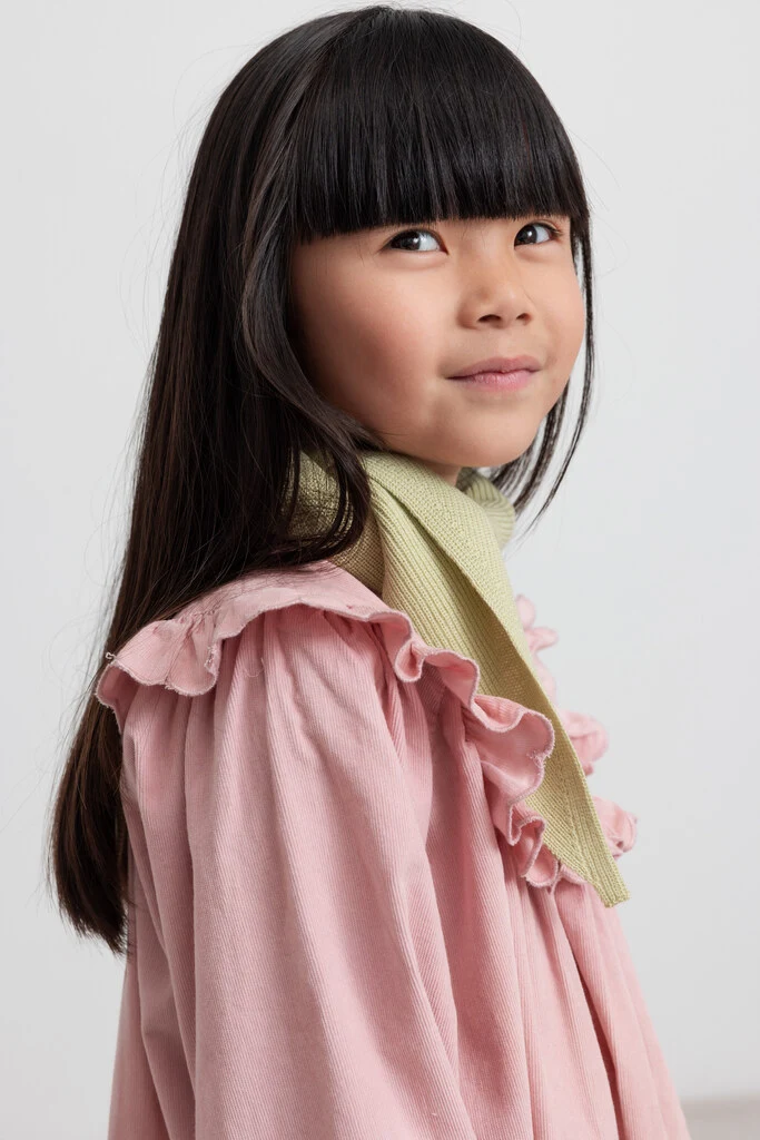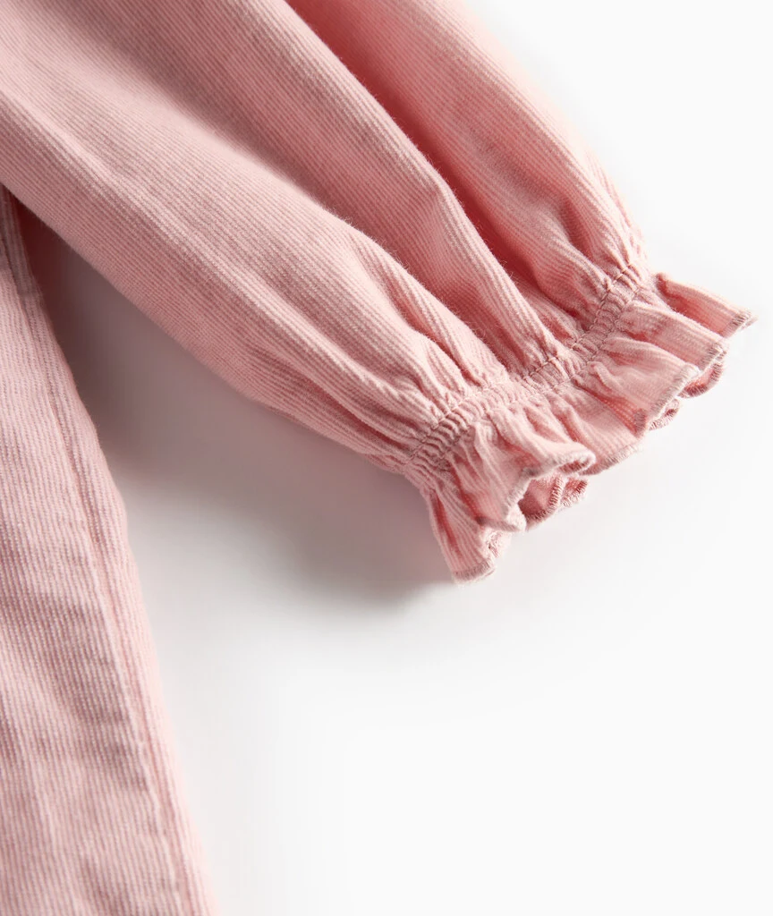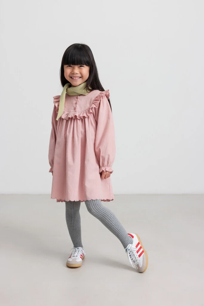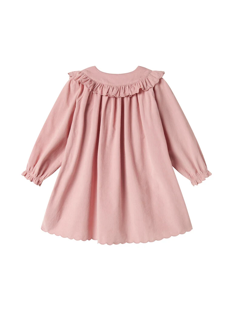 Langærmet kjole, med fint mønster i bunden af kjolen. Fin detalje omkring halsen og i enden af ærmerne.