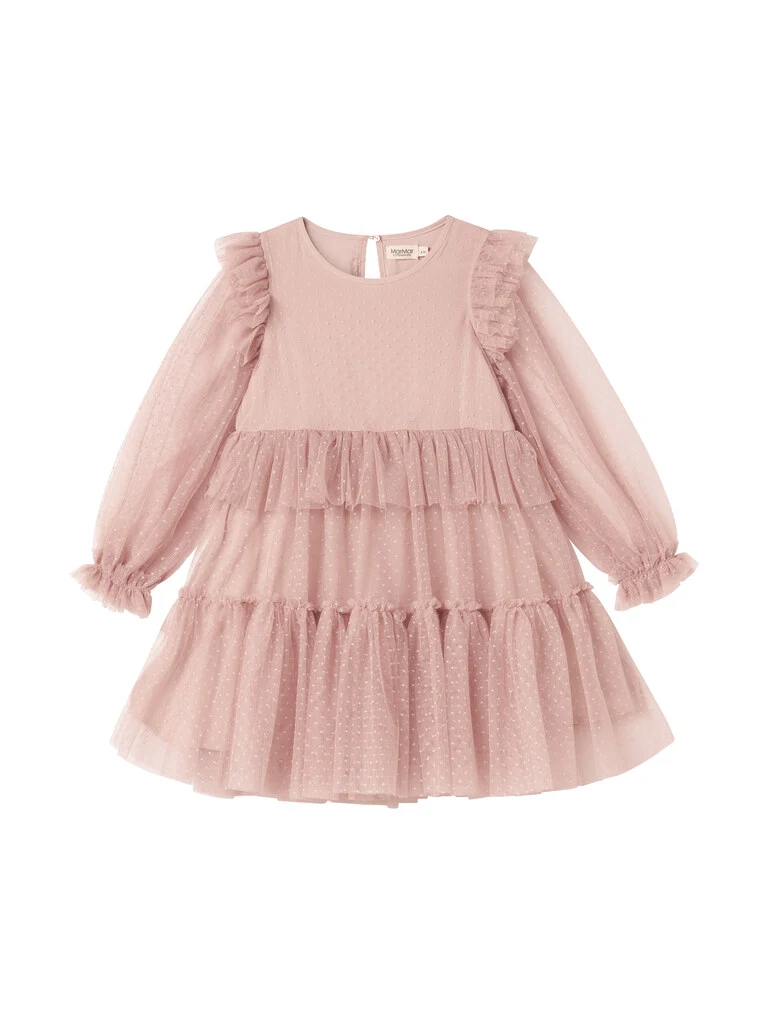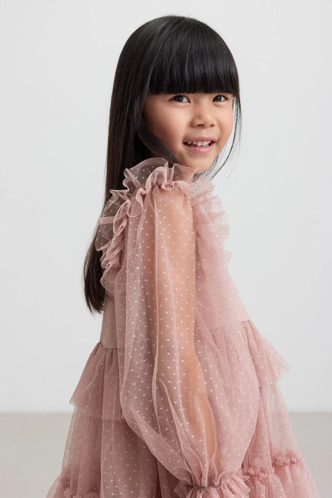 Sommerkjole med lange ærmer. Kjolens ærmer er af tyl, og har et smukt mønster på.