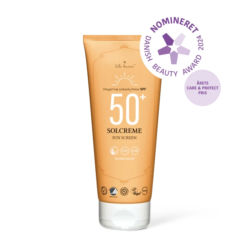 Solcreme SPF50+ er ligesom alt andet solbeskyttelse fra Lille Kanin et top certificeret solbeskyttelsesprodukt, der beskytter huden mod både UVA- og UVB-stråler.