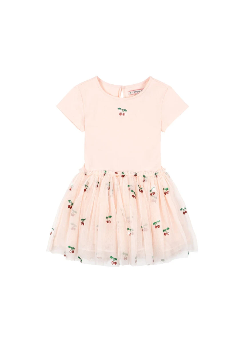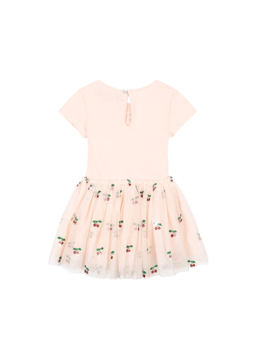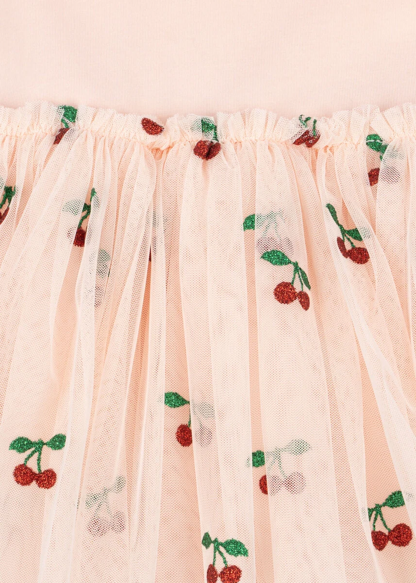 Den perfekte kjole til små ballerinaer, der giver dig lyst til at snurre rundt og hvirvle hele dagen lang. Designet med et voluminøst tylskørt, der er fastgjort til et tætsiddende jakkesæt i et strækbart bomuldsstof med dekorative pailletter.
