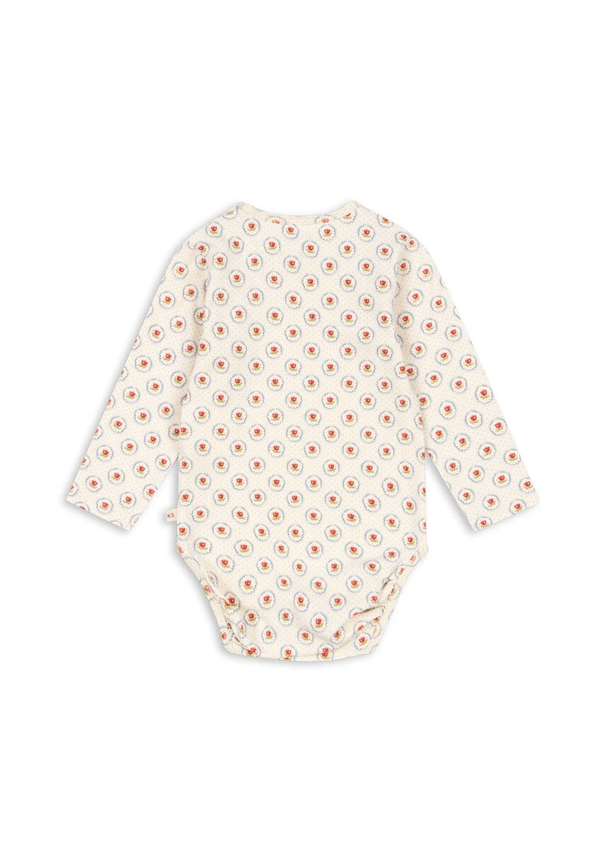 Blød langærmet wrap-body til nyfødte lavet af økologisk bomuld med et strejf af stretch for en behagelig pasform. Har trykknapper langs siderne og i skridtet, der gør det nemt at give din baby på. GOTS, Økologisk, certificeret af CU1094701