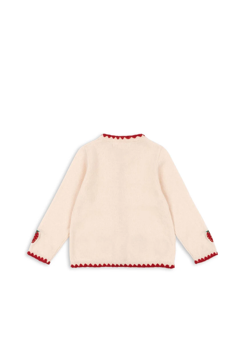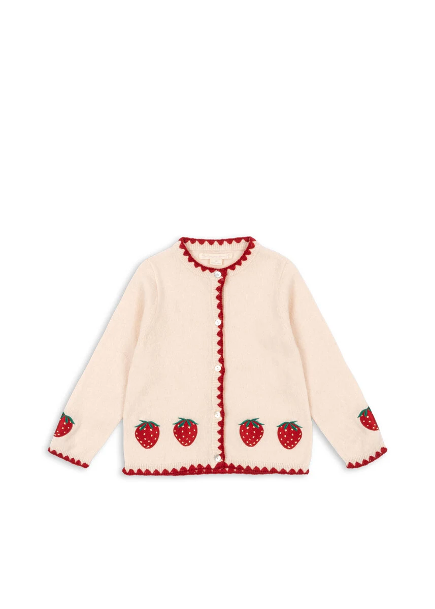 Collette er en usædvanlig blød strikket cardigan med fint jordbærbroderi og kontraststof langs kanterne. Lukkes med perlemorsknapper foran. Lavet af 100% uld.