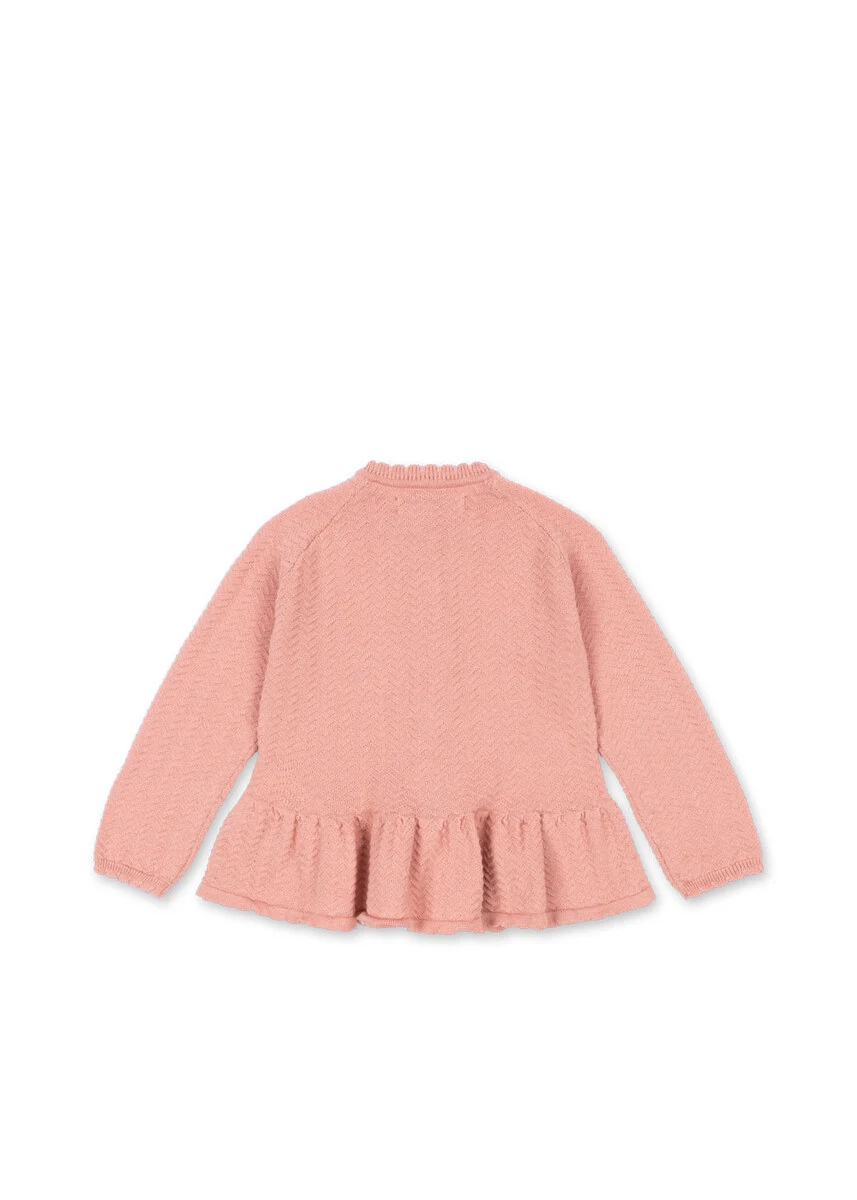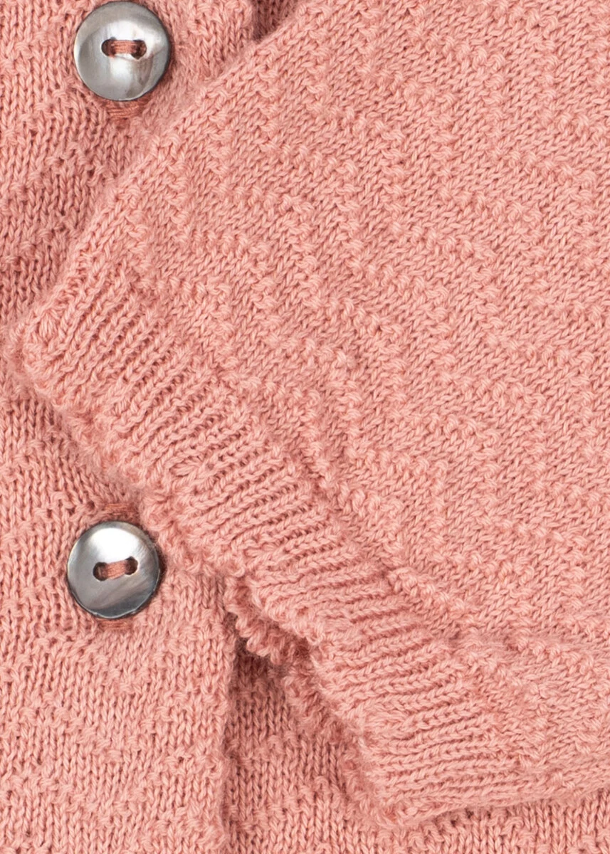 Strikket bomuldscardigan med perlemorsknapper foran. Designet med en løs peplum-silhuet og et bølget kammuslingestrikkemønster. GOTS, Økologisk, certificeret af CU1094701
