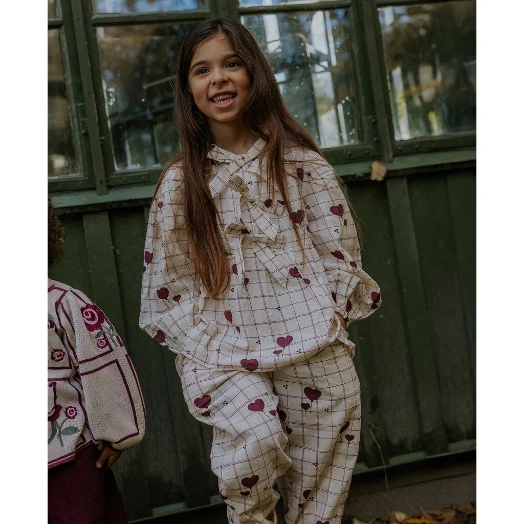 Langærmet let bluse i blød bomuld med tern og hjerteballonprint. Blusen har voluminøse ærmer, rynker ved skulderen og elastik i ærmerne. Der er en søm i taljen med et nederdel, der giver blusen volumen. Halsudskæringen er rund, og der er stofbetrukne knapper ved skulderen, der gør den nem at tage af og på. Blusen er dekoreret med sløjfer foran, hvilket giver den et feminint og sødt look. Detaljerede oplysninger: - 100% bomuld - Maskinvask ved 30°C på skåneprogram - Kort centrifugering - Må ikke bleges - Må ikke tørretumbles - Stryges ved lav temperatur. Maksimumstemperatur 100°C - Må ikke renses