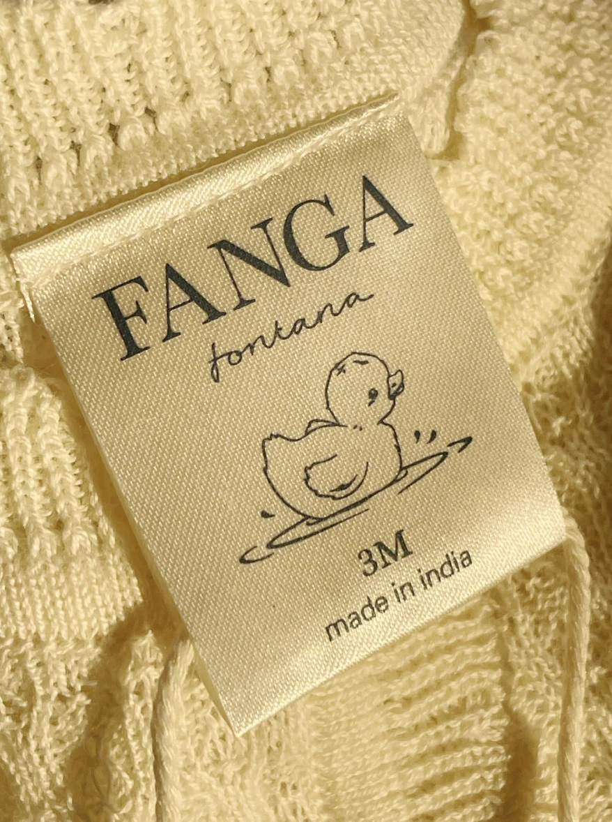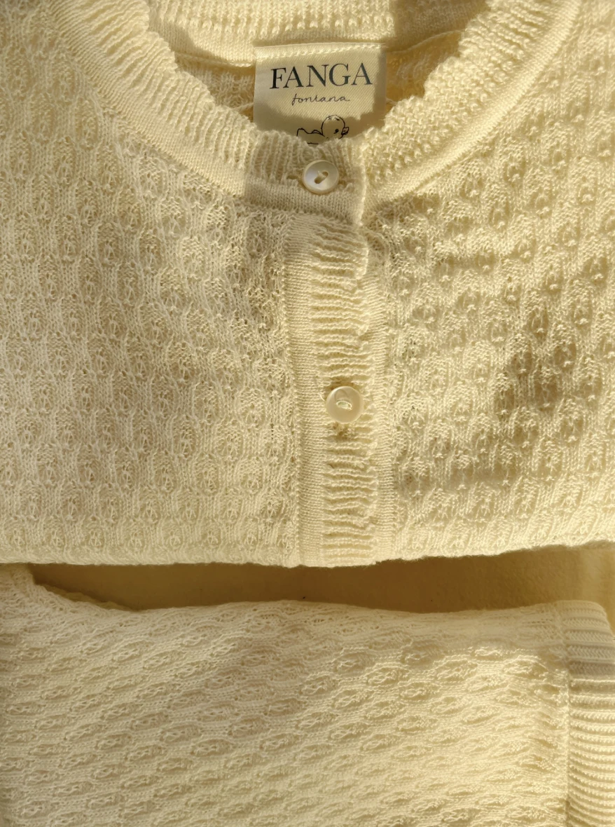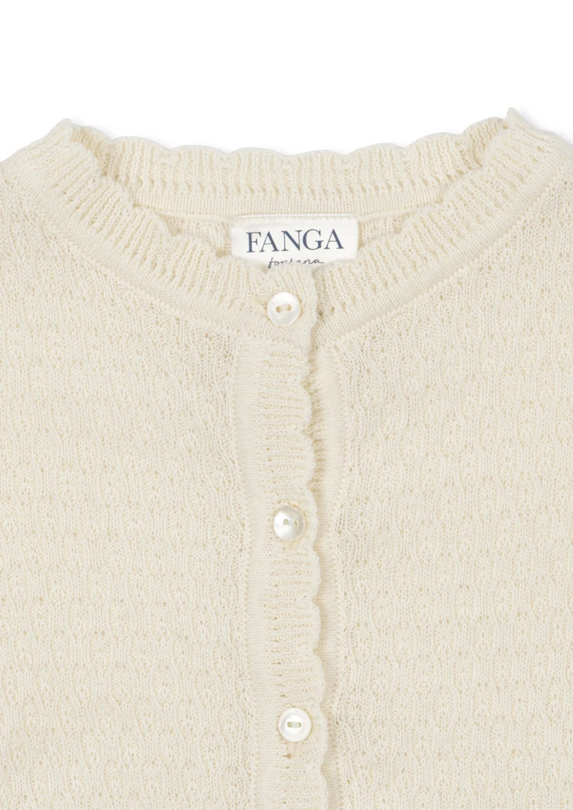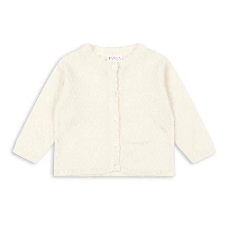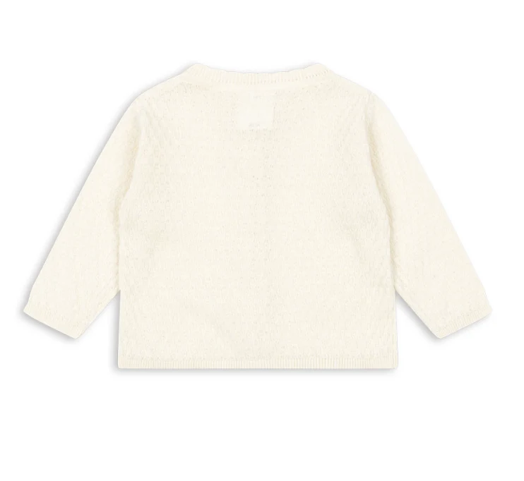 Let cardigan i et delikat pointelle-strikmønster. Lavet af 100% økologisk bomuld, der er blød og åndbar, og designet med bølgede kanter og perlemorsknapper foran. GOTS, økologisk, certificeret af CU1094701